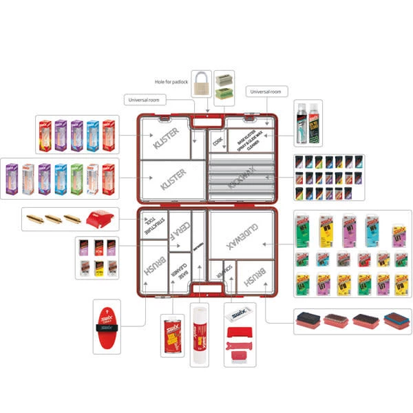 Grande mallette spécialement conçue pour le rangement et le transport du matériel de préparation des semelles de skis nordiques. Elle possède de nombreux compartiments destinés à recevoir : hardwaxes, klisters, farts de glisse, nettoyants, brosses, grattoirs, bouchons et outils de structure.